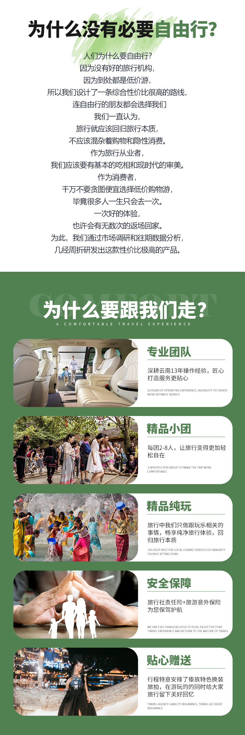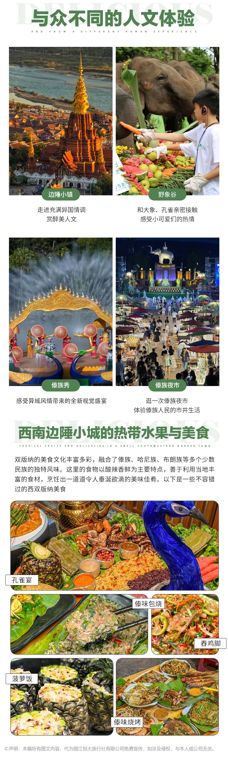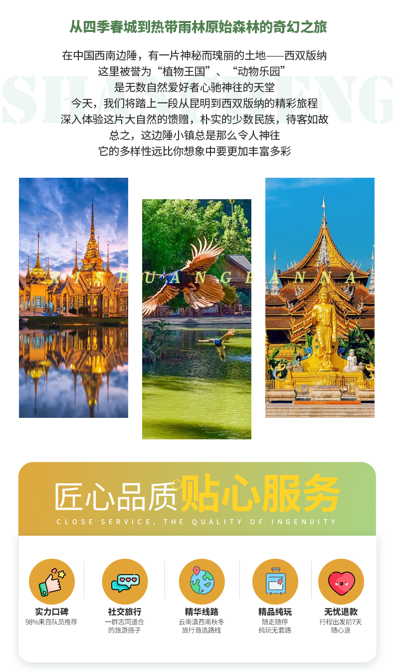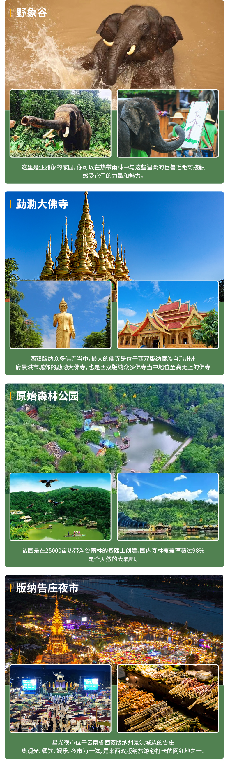 3、景点:行程内所列景点门票(曼听公园、告庄西双景、野象谷、原始森林公园、勐泐大佛寺、茶山徒步、傣族原始部落);
