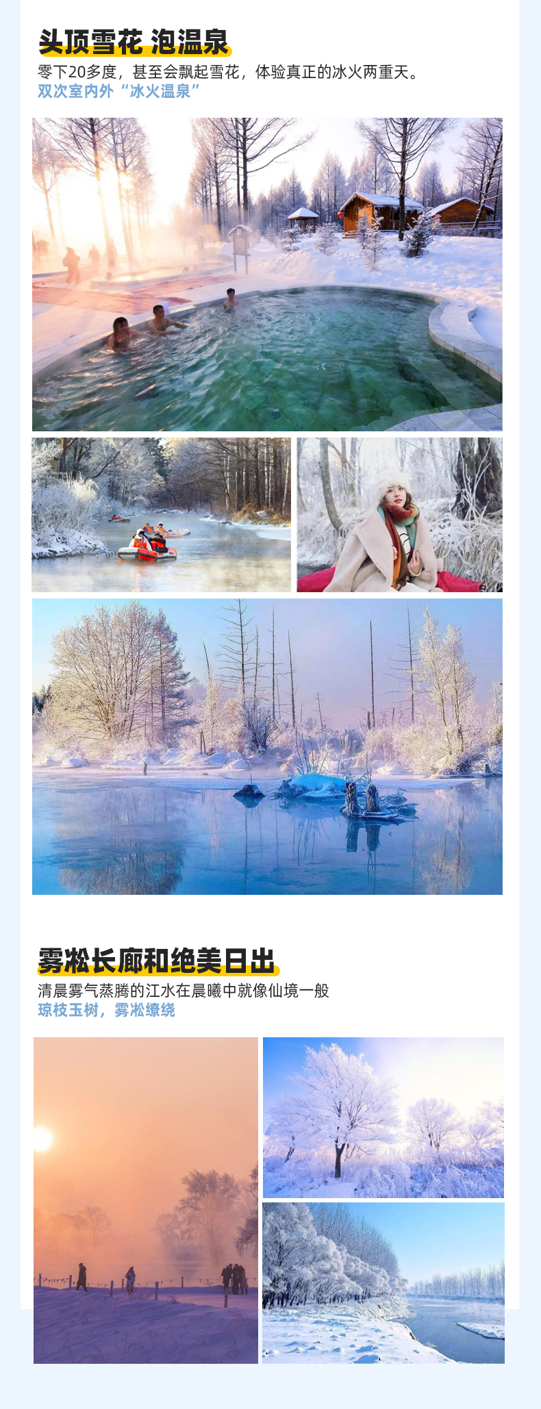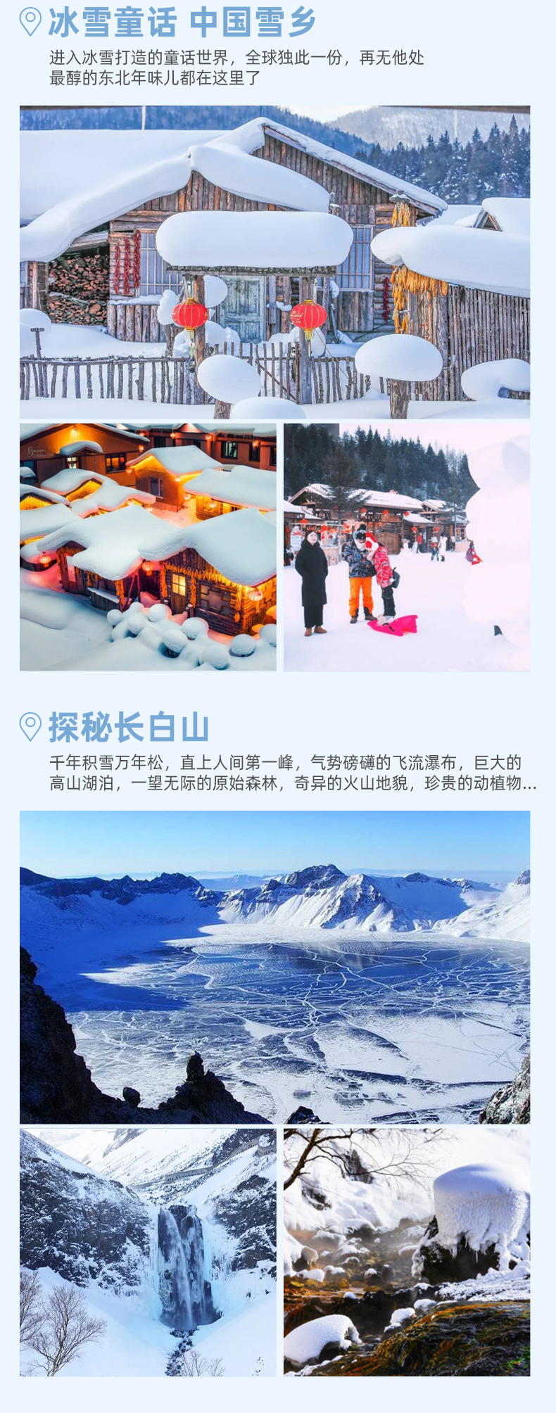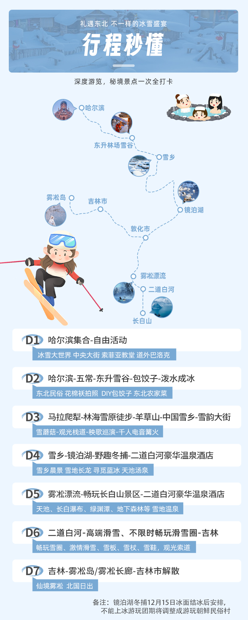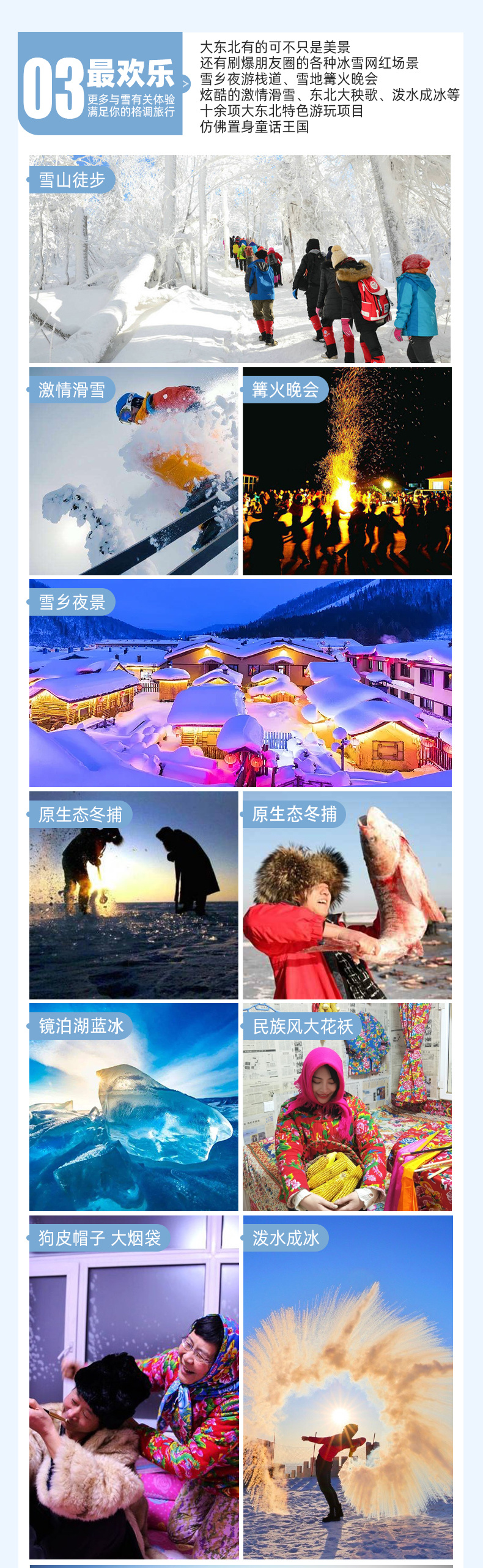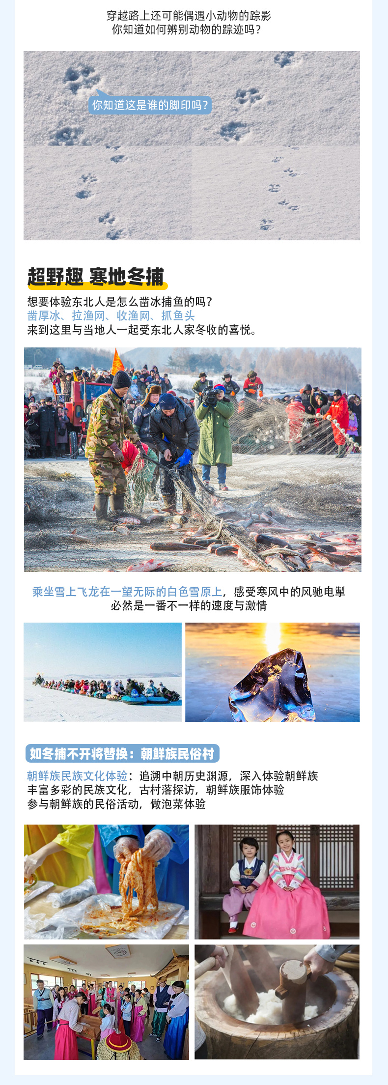 备注:【寒地冬捕】【雪上飞龙】【马拉爬犁】等雪上活动12月中旬冰面封冻体验;如不能玩冰上活动会替换成朝鲜族民俗村。