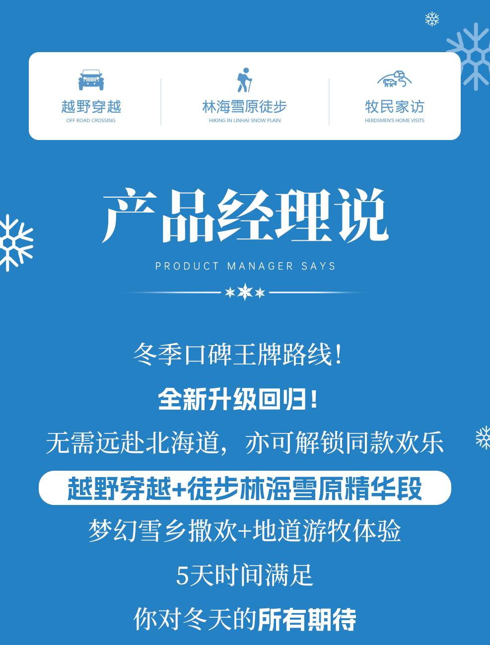 早餐后出发,乘车/步行前往【神秘牧场】,开启激动人心的【雪原徒步之行】(徒步里程12km,耗时约3-4h)。