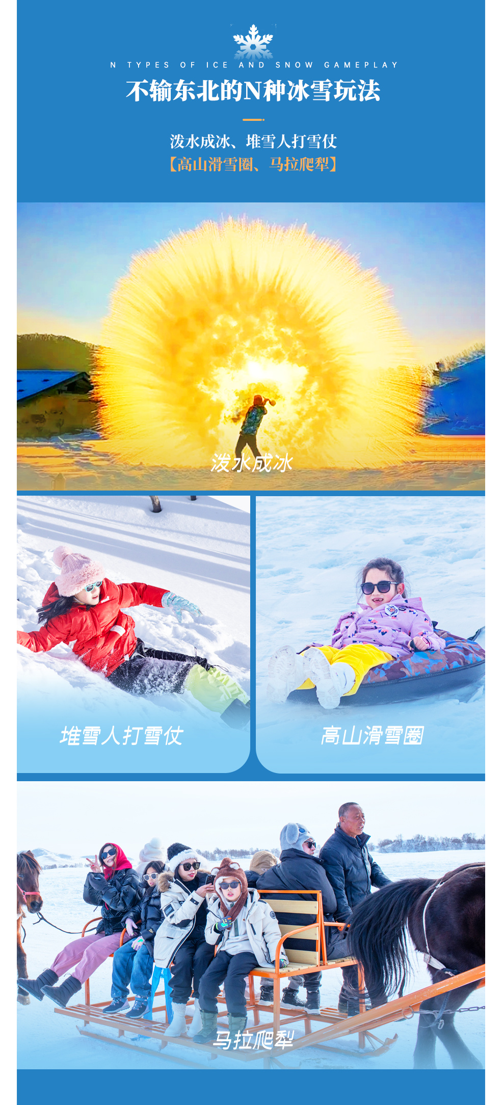 下午前往【塞北雪乡】【白家窝铺】玩雪撒欢。在这里,我们还可以体验泼水成冰,热水的水蒸汽四散开来完全暴露在空气中,在乌兰布统极度低温的状态下,就会形成类似雾状的形态,也可以堆雪人、打雪仗、高山滑雪......多种游玩项目带你找回童年的简单快乐!