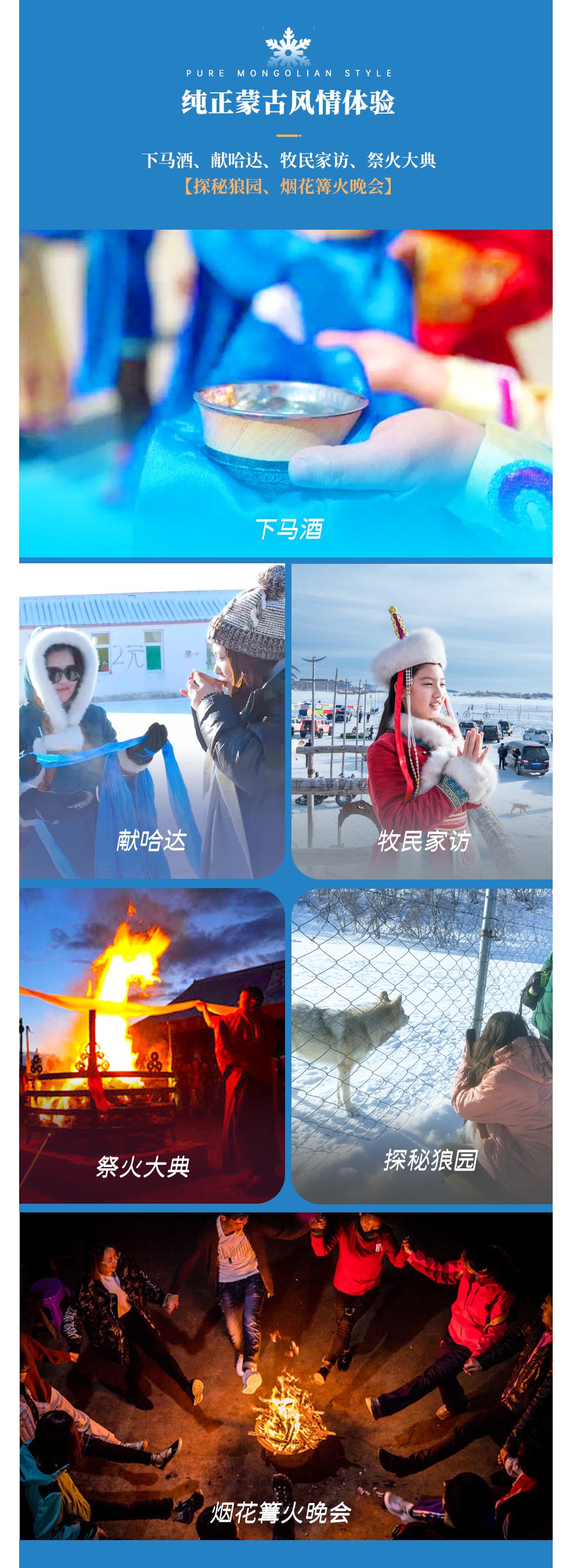 随后乘坐马拉爬犁开启游牧部落的欢乐时光,体验蒙古舞蹈、高山滑雪(不限次数)、驰骋雪原、参加祭火大典,还可以进入狼园,野狼高空捕食,智斗野鸡,明星狼参观合影,群狼夺肉,训狼表演....当然也可以自费租赁蒙古袍,在指定蒙古包中换上色彩艳丽的冬季蒙古袍+蒙古帽,拍摄游玩更有感觉~(可选自费:蒙古袍50/套)