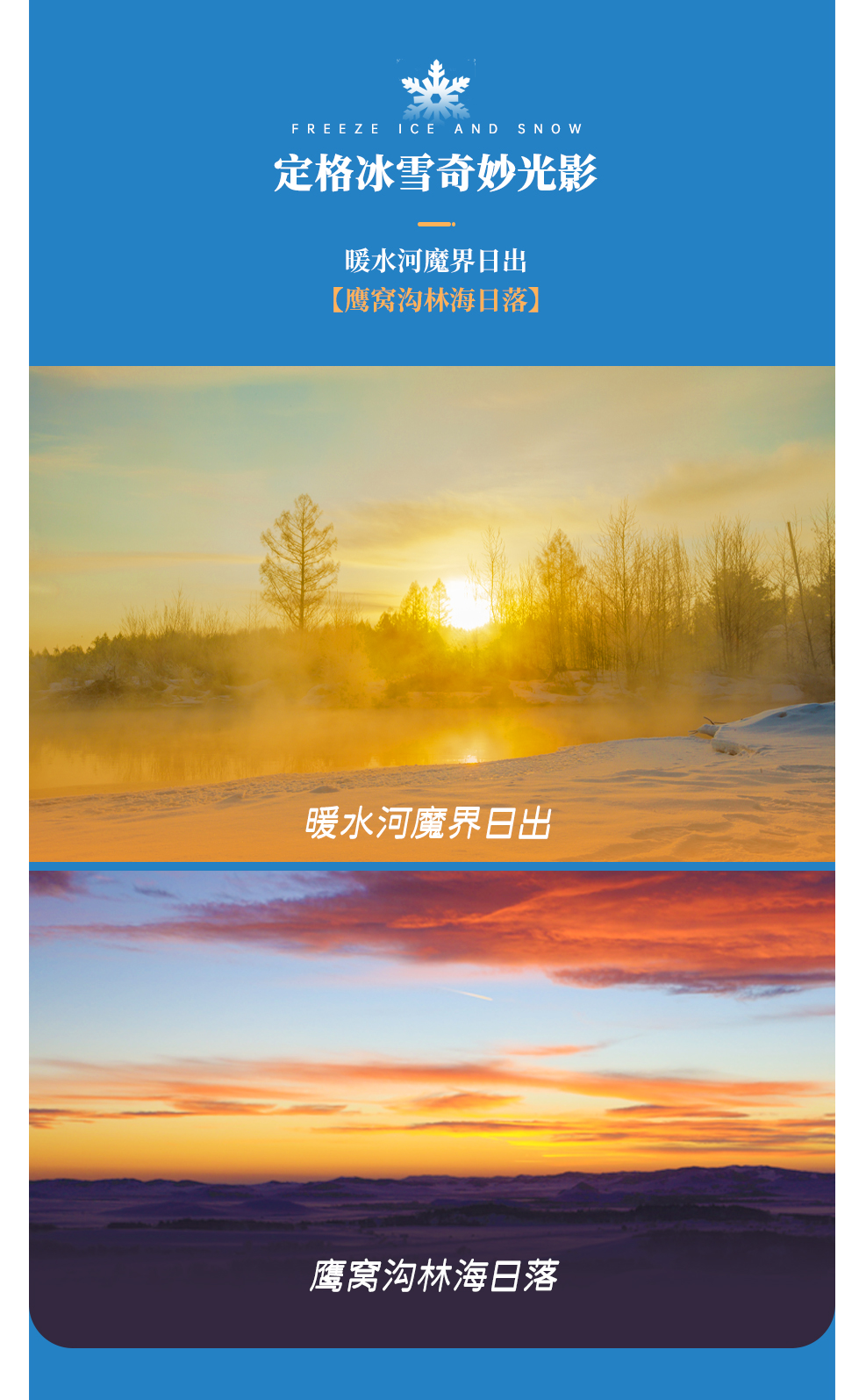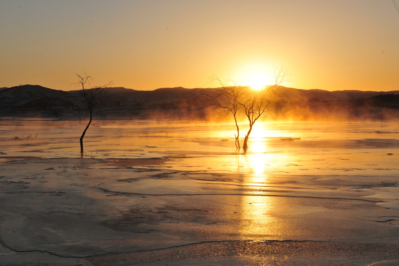 今天我们要早起,乘坐越野车前往号称“魔界”的【暖水河】观赏日出(车程约40分钟),我们在坡顶支好摄像设备,可以看到沟地的河流还有未冻结的部分,日出时分水雾蒸腾起来,烟雾缭绕...太阳逐渐从地平面升起,从远方的山坡间“挤”了出来,天边的云从暗青色转为了暖橘色、粉色...大家要耐心等待日出,一定不会让你们失望!