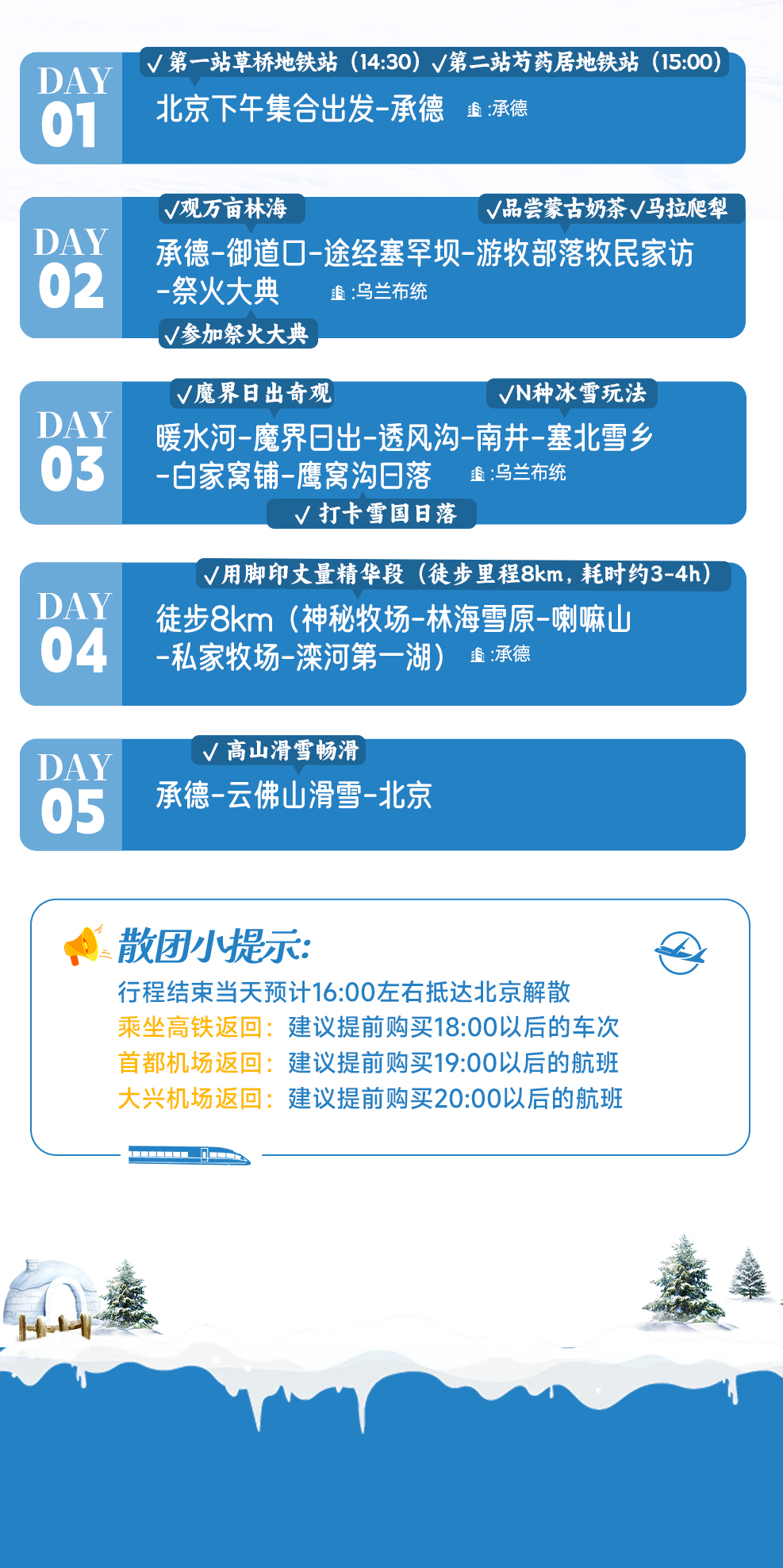 午餐后,我们继续滑雪,下午14:00大家退还雪具,集合返回北京解散,大约15:30,我们到达北京,结束愉快的冰雪狂欢之旅!期待我们下次相遇哦~