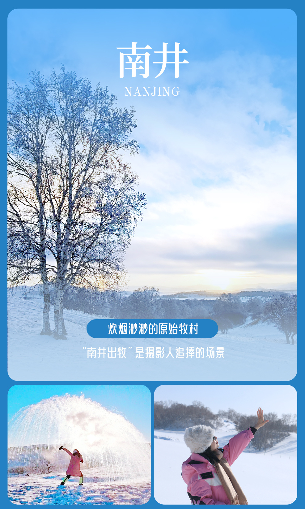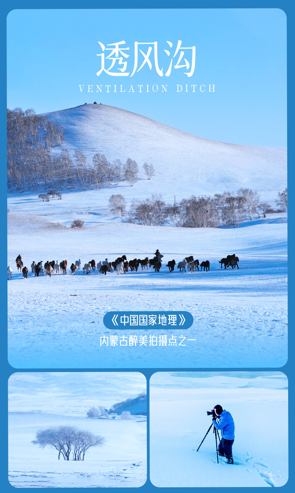 观赏日出后,大家一起前往【透风沟】,这里是坝上草原的经典摄影点,中间流淌着盘龙河水,岸两边灌木林,白桦林形成独特的生态景观,都是拍摄雾凇、冰面水泡子、内蒙人家等绝佳素材。随后,我们前往【南井】,冬季的南井拍雪地水墨丹青,白桦倒影。蔡树分布匀称,美轮美奂。