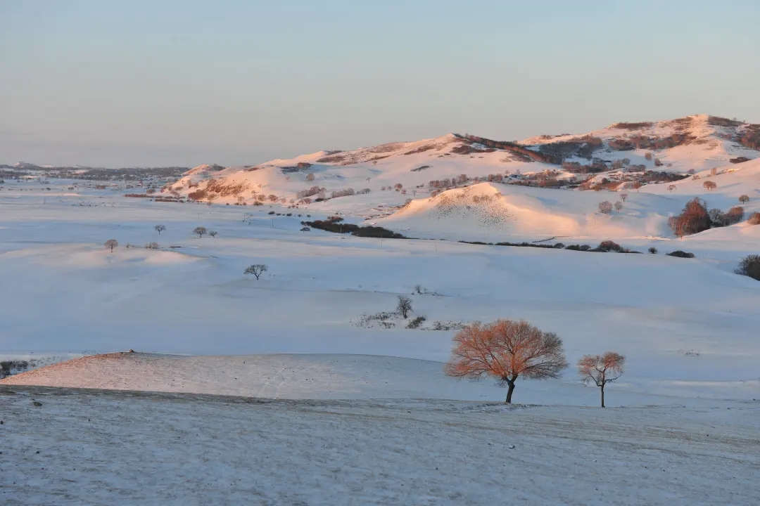随着夕阳西下,我们驱车来到【鹰窝沟】看日落,这里有雪丘之上的排排白桦林,在阳光照射下白桦树干与白雪争辉,长长的树影拖在雪丘之下层次分明,温柔铺展一幅绝美画卷。