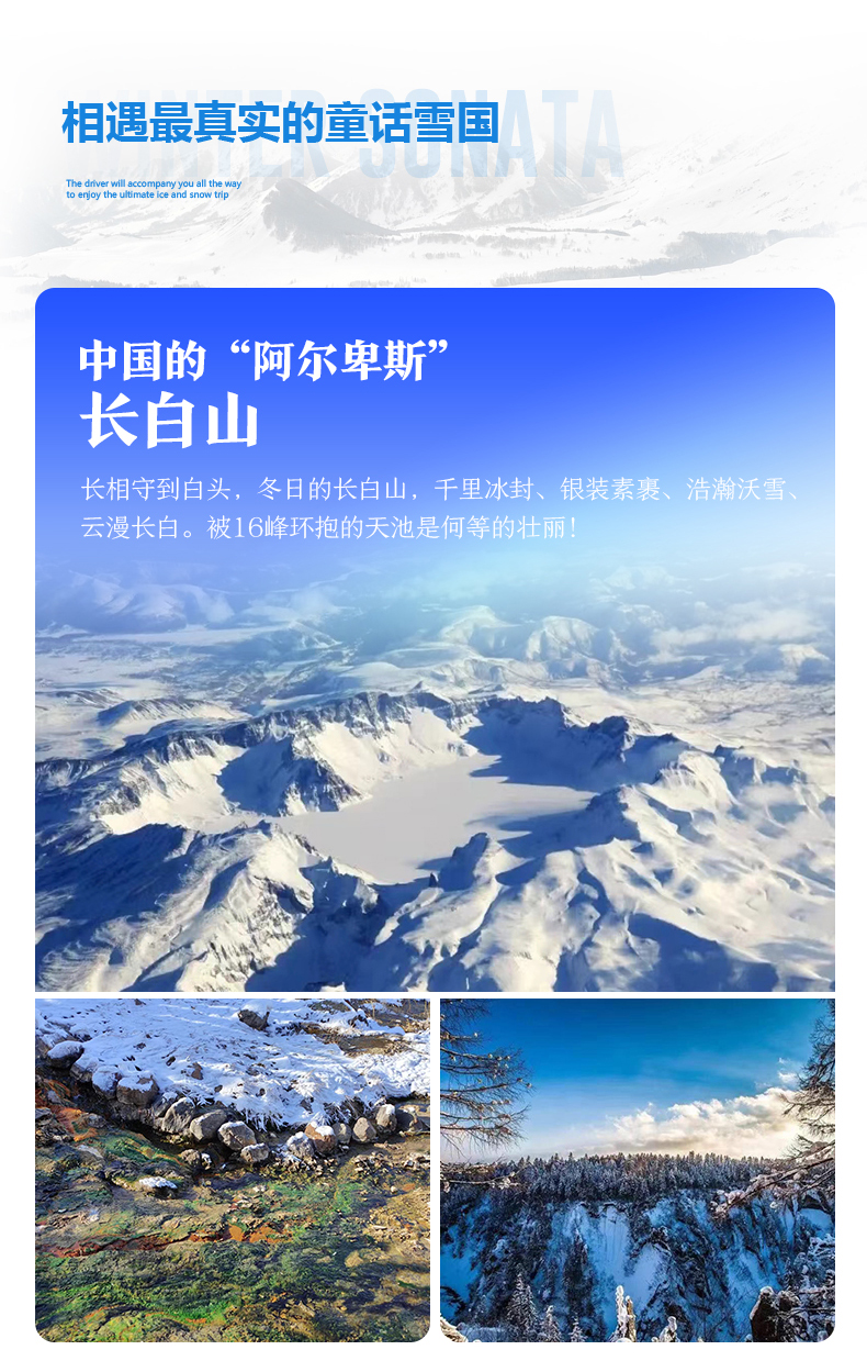 √ 游玩09:30-16:30,冬季的长白山银装素裹、分外妖娆,聚龙温泉,雾气腾腾犹如仙境。长白山北景区自行游览!
