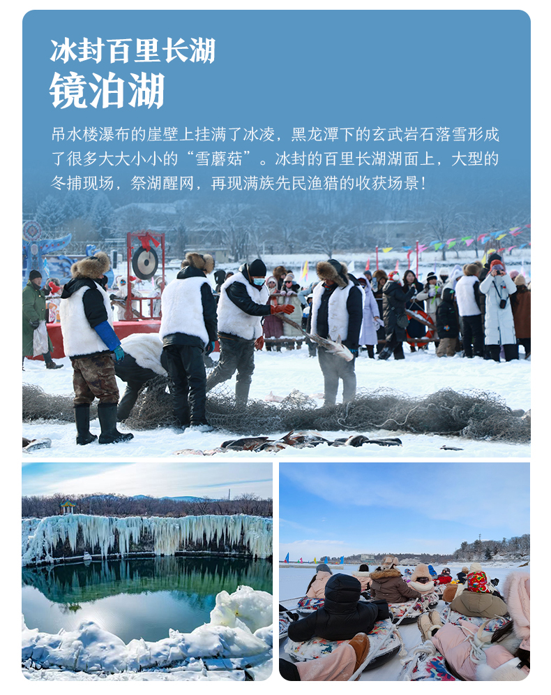 注:镜泊湖封冻期为每年12月20日左右-次年2月20日左右,镜泊湖冬捕、雪堡、冰面雪圈预计1月1日以后开放!部分团期未在封冻期无法游玩,则更换为雪乡景区内的梦幻家园景景区,敬请谅解。