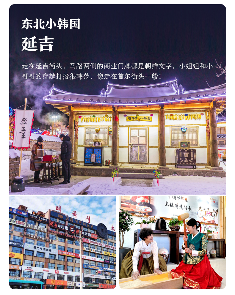 √ 车程13:30-15:00,出发前往东北小韩国【延吉】,延吉市是延边朝鲜族自治州的首府,这是一个充满韩范的城市,朝鲜族比例占一半以上,汉族这里是少数民族。走在延吉街头,马路两侧的商业门牌都的朝鲜文字,人们的穿越打扮也像是首尔街头。