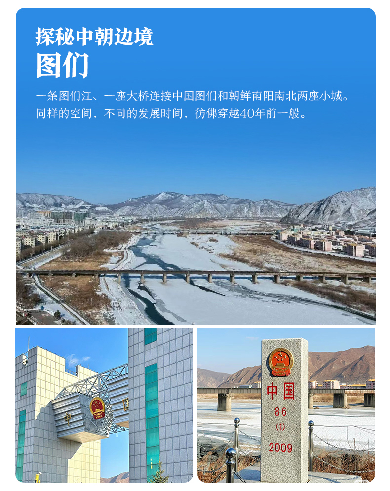 √ 游览10:30-12:30,「图们江公园」江岸设有码头,以及中朝87号界碑。「图们口岸桥」始建于1941年,是当时日本为了便于统治中国东三省和朝鲜建造的,至今仍在使用。大桥不宽,仅上下两车道,中国游客只能走到桥中央,就不能再往前走了,否则就出国了。站在这里可以以最近的距离观望朝鲜稳城郡南阳市哦。「86号中朝界碑」就在不远处和「铁路国门」拍照打卡哦。「南阳亭观光台」看中朝两国风光,这里视野开阔,图们江水南北分属中朝两国,朝鲜的南阳市近在眼前,学校、民居清晰可见。(游览时间:2小时),可在图们市午餐,午餐自理!