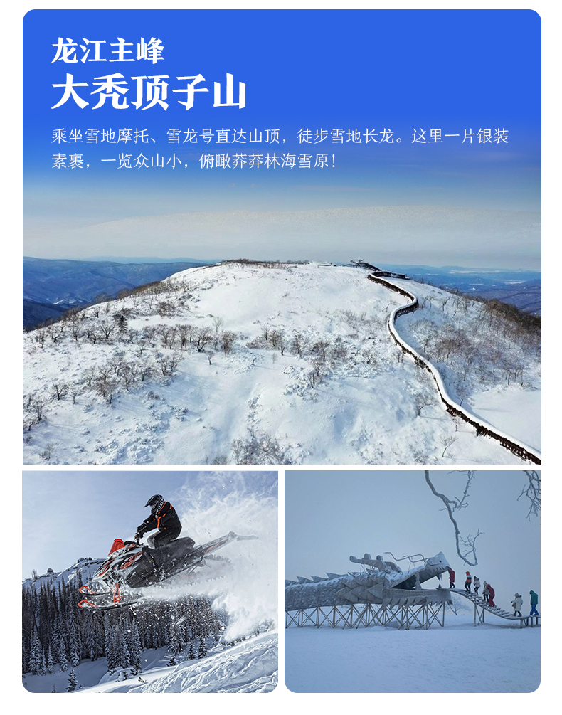 √ 游览12:30-14:00,乘「雪地摩托」穿越林海雪原是一次非常难得的体验,那种风驰电掣的感觉非常刺激。走在雪地长龙栈道内,登上「雪地长龙」,大雪覆盖的山上,只有高山岳桦婀娜起舞,岳桦的性格就是在高山上生长,别看它矮小而且虬枝蔓延,但它是树木中顽强的代表。祭拜「雪龙顶冬坛」,仿佛北京天坛底座建造了两条巨龙。