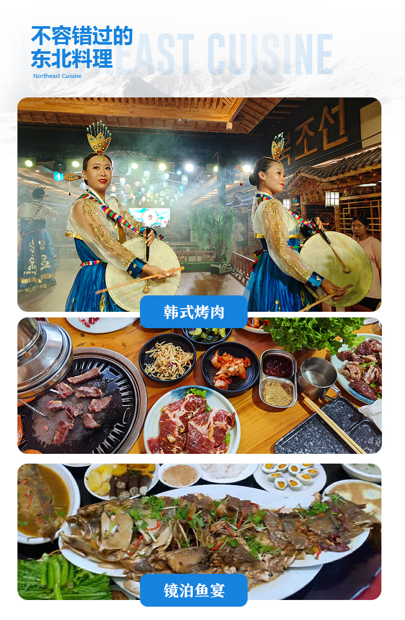 【餐 饮】6顿酒店早餐、2特色餐(韩式烤肉、镜泊湖鱼宴)