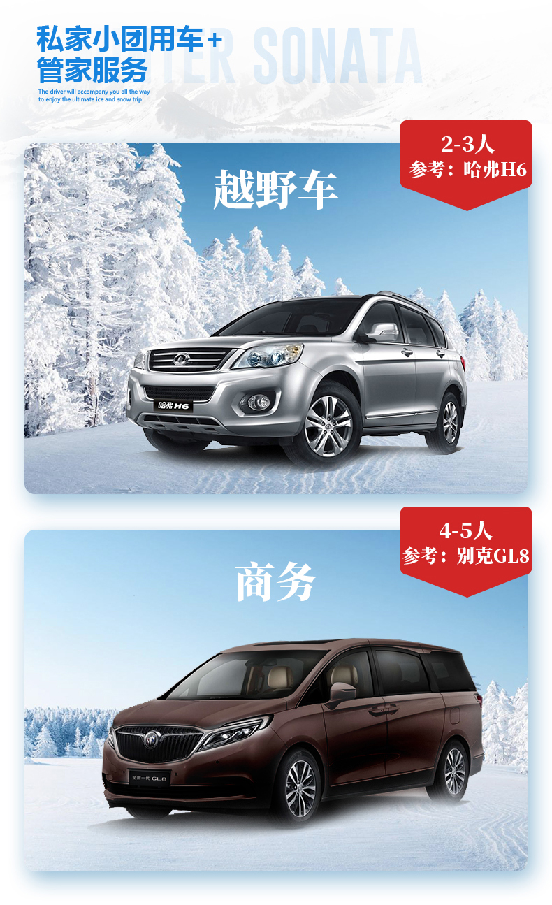 【交 通】2-3人SUV越野车、4-6人7座GL8/15座商务,全程包车费用、过路费,燃油费,停车费,驾驶员服务费、食宿费等