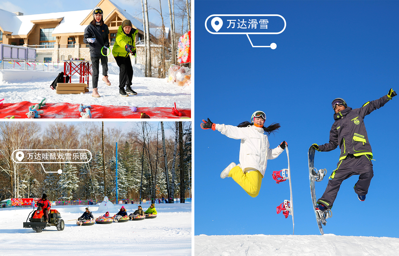 √ 滑雪+娱雪08:00-14:00,万达度假区「滑雪」免费提供雪鞋、雪板、雪仗、头盔、缆车和魔毯。您可以选择性自备雪服、风镜与手套等物品!