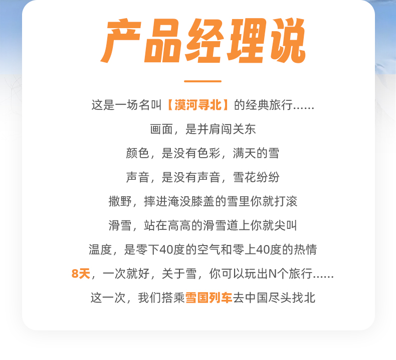 备注:2、儿童价格为1.2米以下,不含门票、酒店床位费、早餐、滑雪及哈尔滨到漠河往返火车卧铺;