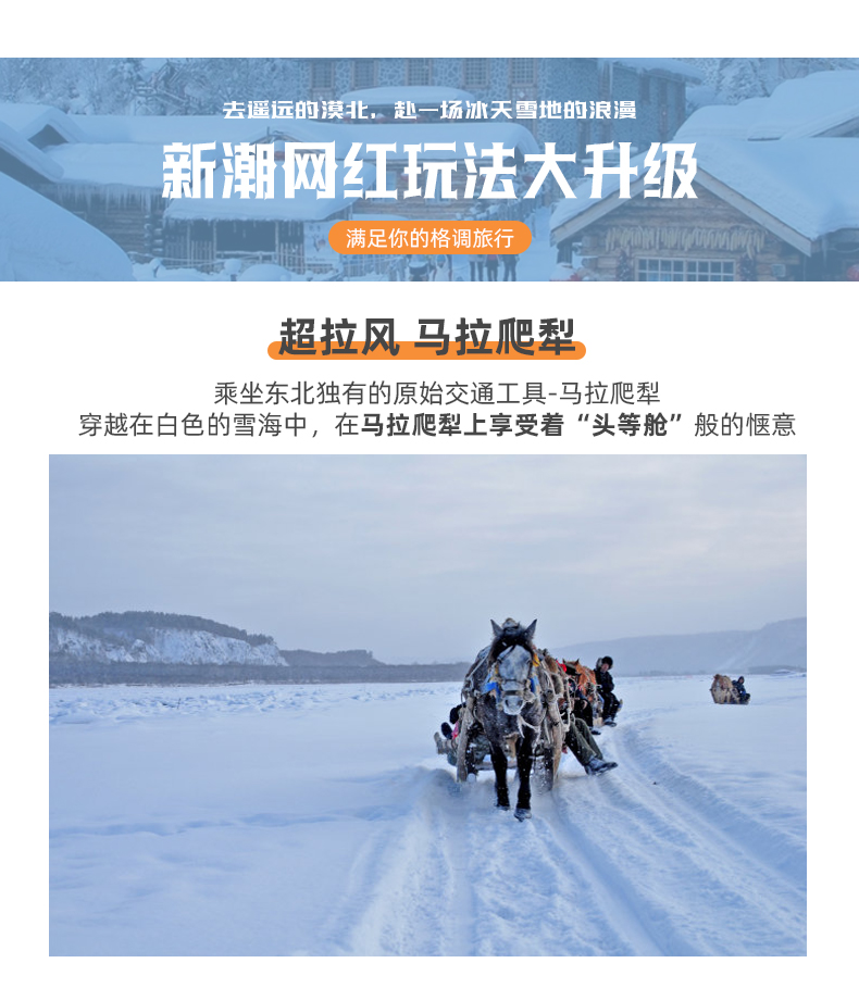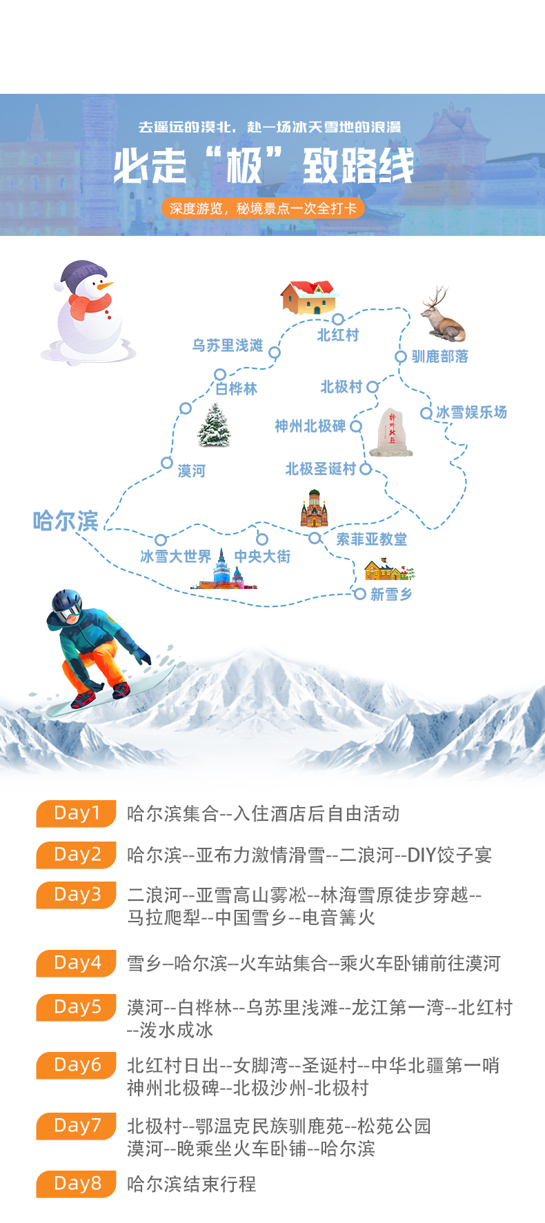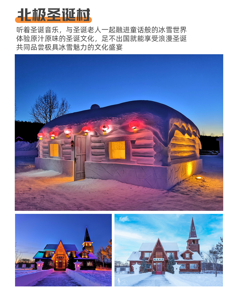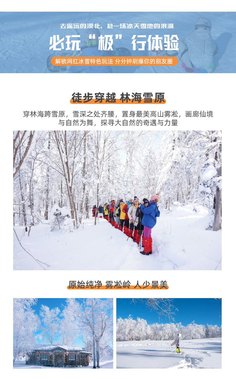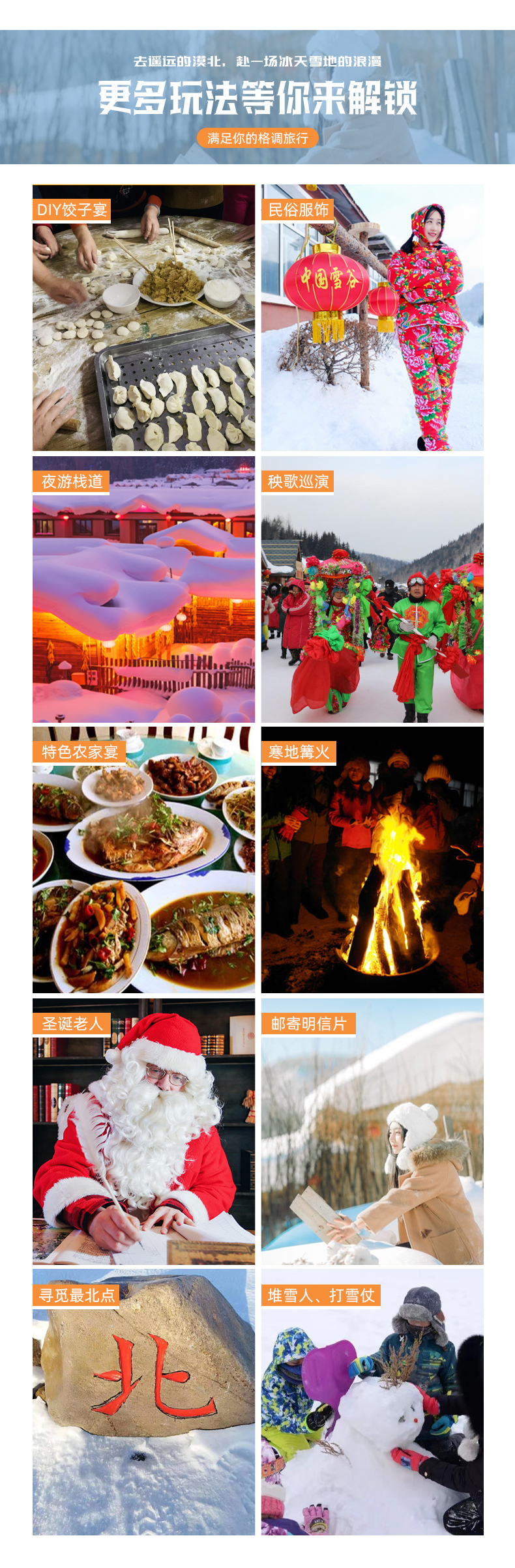 DIY饺子宴、激情滑雪、民俗服饰、堆雪人、打雪仗、徒步雪山、夜游栈道、秧歌巡演、特色农家宴、寒地篝火、夜拍星空、冰上娱乐活动、鄂温克驯鹿部落、泼水成冰、马拉爬犁、蓝冰气泡、圣诞老人合影、邮寄明信片、寻觅最北点等(不参加无费用退回)