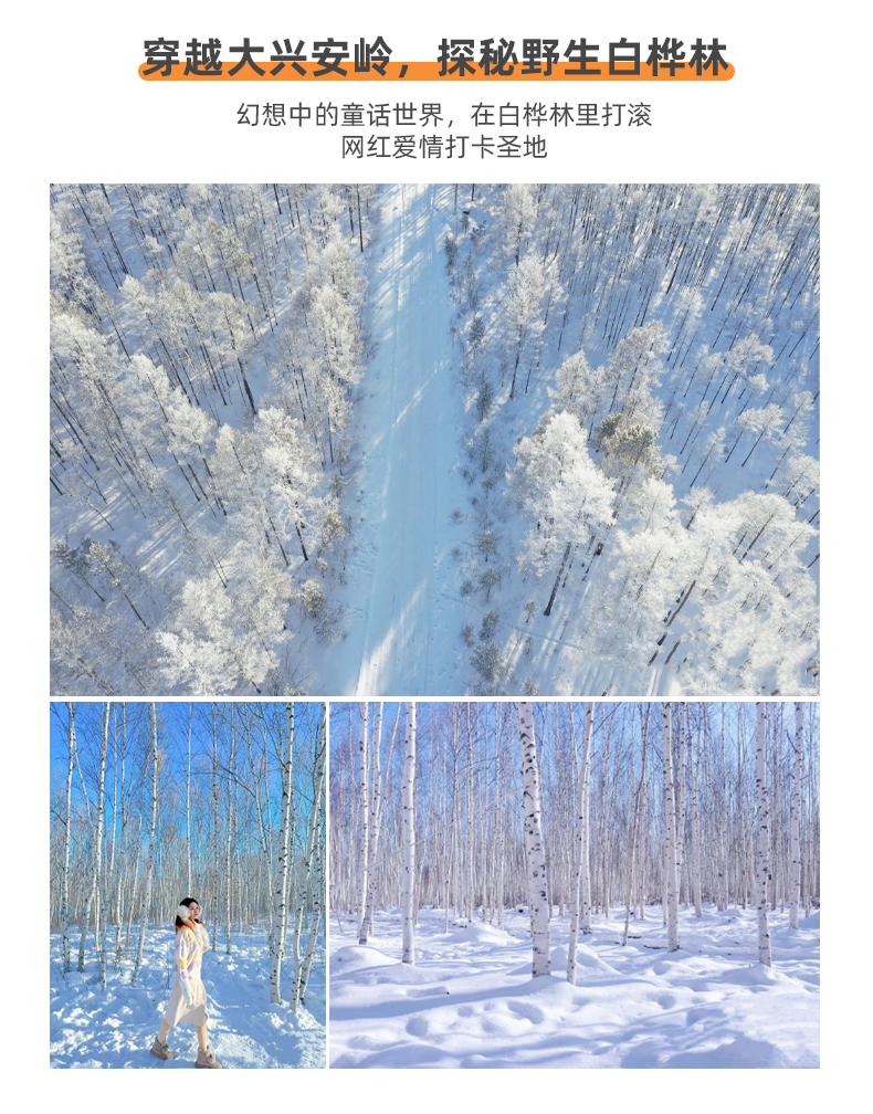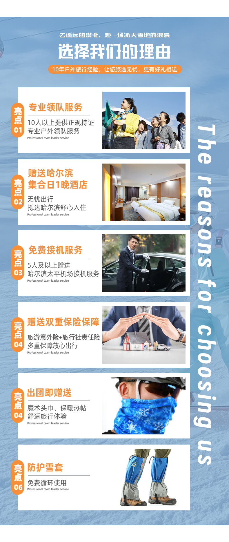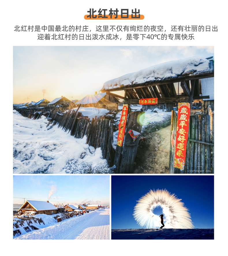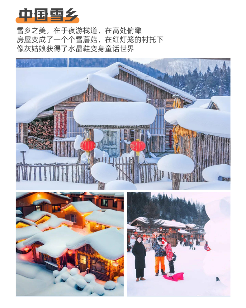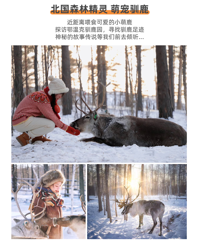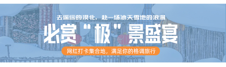 DIY饺子宴、激情滑雪、民俗服饰、堆雪人、打雪仗、徒步雪山、夜游栈道、秧歌巡演、特色农家宴、寒地篝火、夜拍星空、冰上娱乐活动、鄂温克驯鹿部落、泼水成冰、马拉爬犁、蓝冰气泡、圣诞老人合影、邮寄明信片、寻觅最北点等(不参加无费用退回)