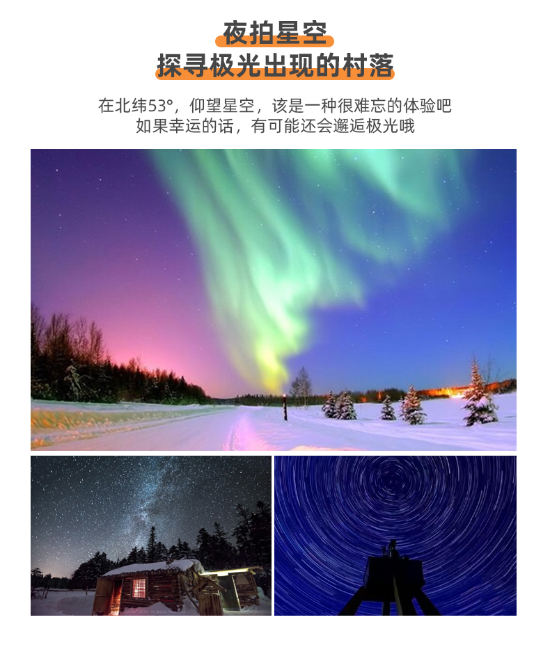 冬季的乡村,黑夜在四五点时便已降临,在太阳西沉后的漫长黑夜里,你可以带上你的相机到村庄外仰望星空,记录北国的静夜,幸运的话可以偶遇北极光。