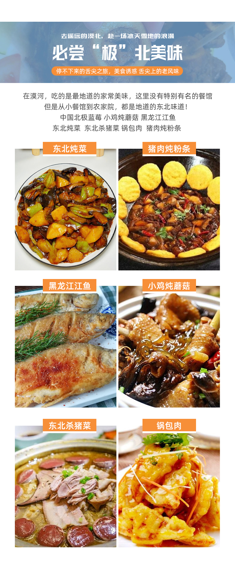 3.全程包含5早餐:哈尔滨早餐、二浪河早餐、雪乡早餐、北红村早餐、北极村早餐,(有两个早餐火车上自理)