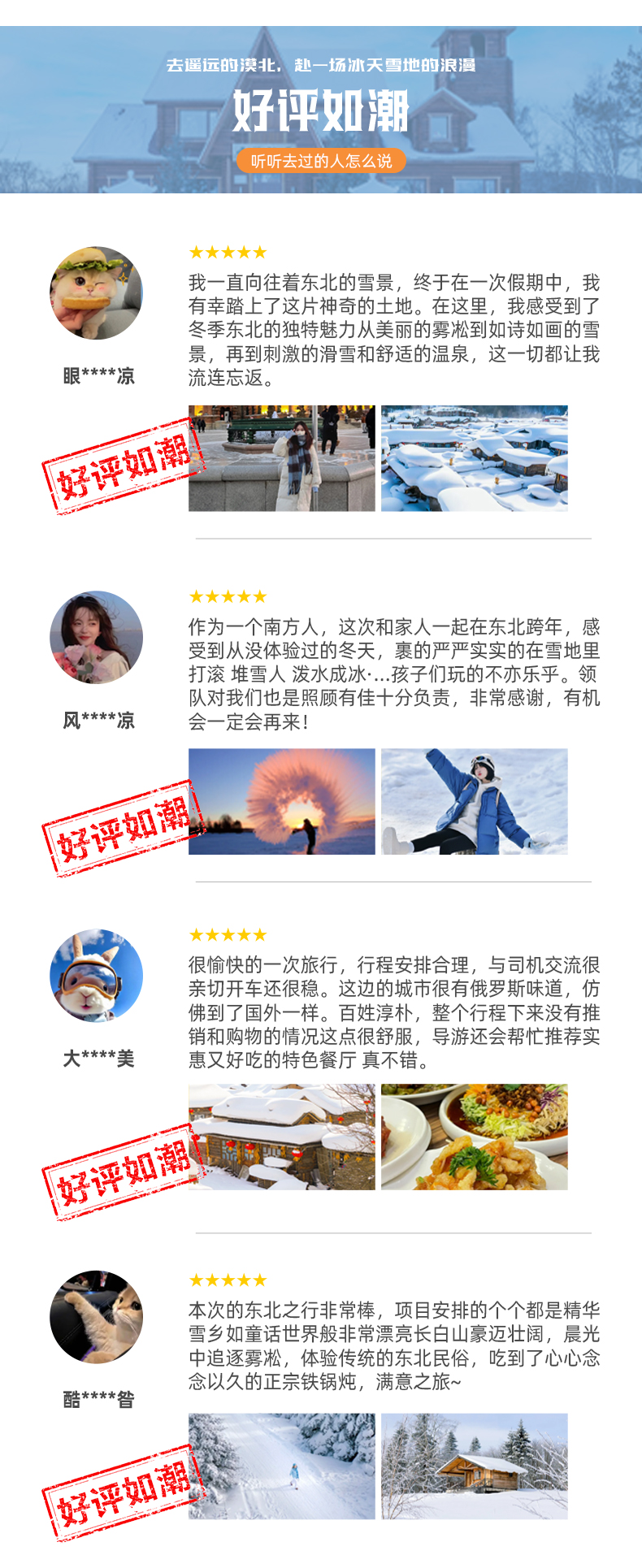 5.全程门票费:亚布力初级滑雪3小时(包含雪具费用)、雪乡门票、大雪谷穿越、北极村门票、圣诞村门票、龙江第一湾+乌苏里浅滩门票、驯鹿苑门票